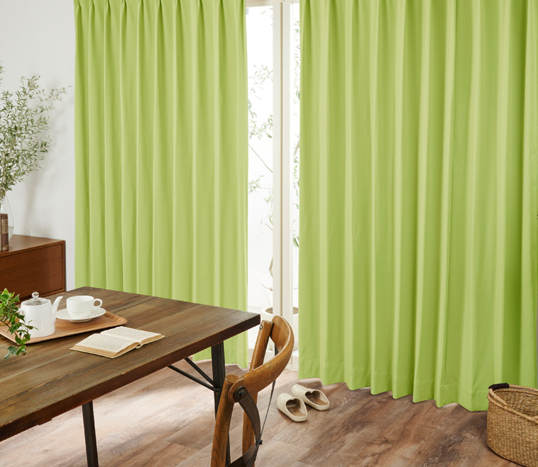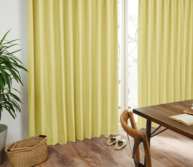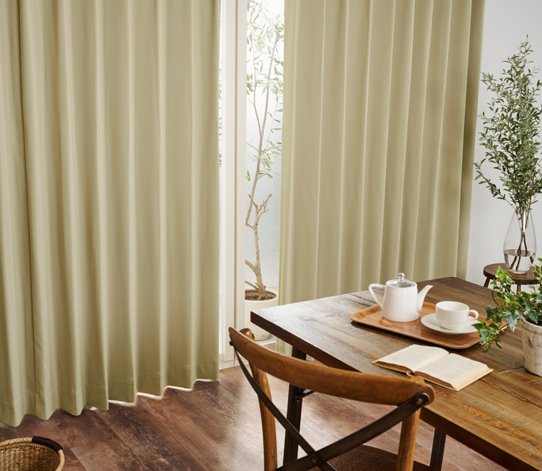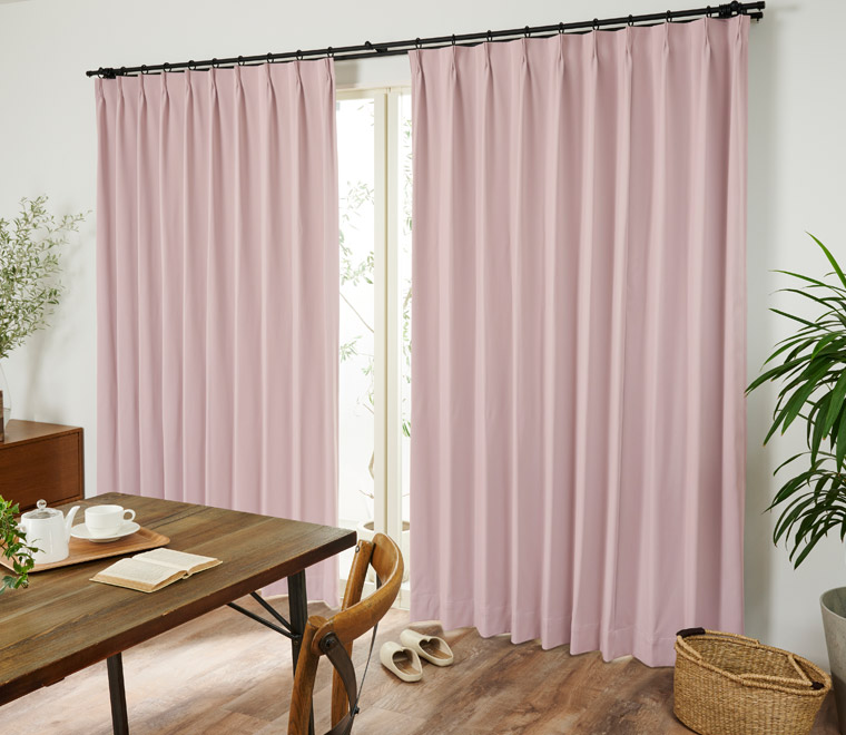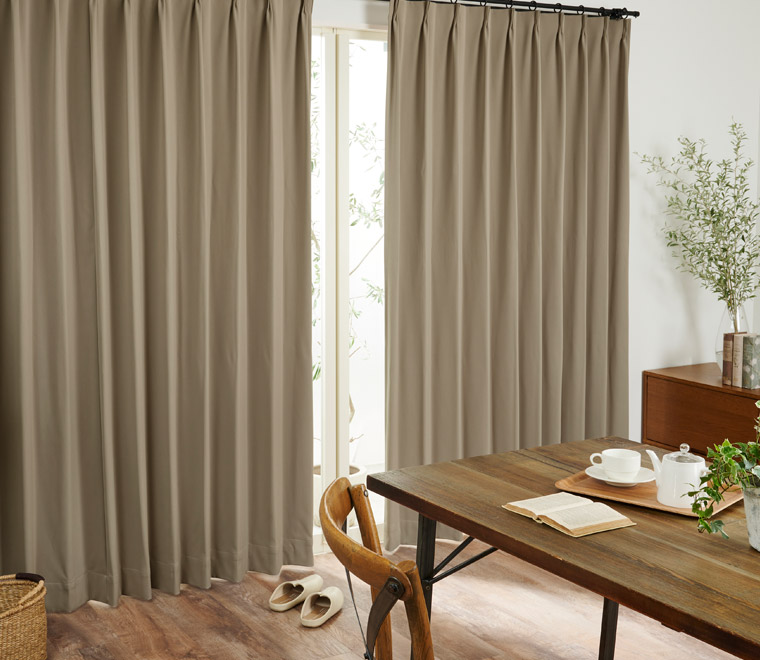 カーテンの仕上がりに対して約1.5倍の生地を使い、上部のヒダを2つ山で摘みます。ベーシックなスタイルでスッキリと仕上がります。
