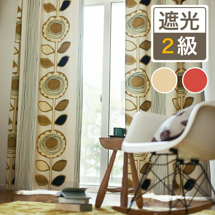レトロなひまわり柄がお部屋の主役になる2級遮光カーテン サンフラワー(D-1196)|遮光カーテン通販専門店|ふくろうのカーテン