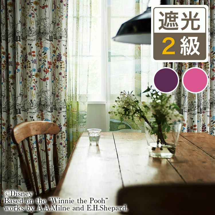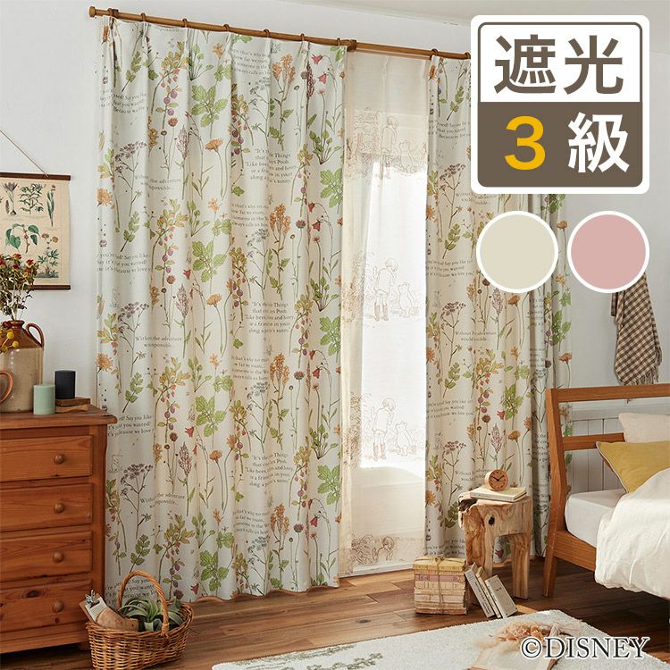 ナチュラルな色合いの生地に水彩画風の草花。その合間に描かれているのは、クリストファー・ロビンがプーさんに絵本を読んであげているシーン。心癒されるデザインの2級遮光カーテンです。