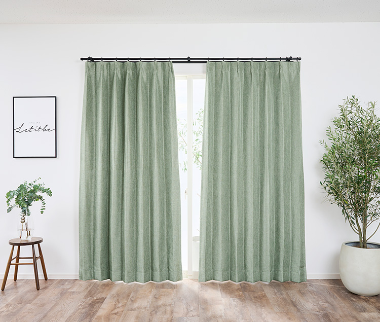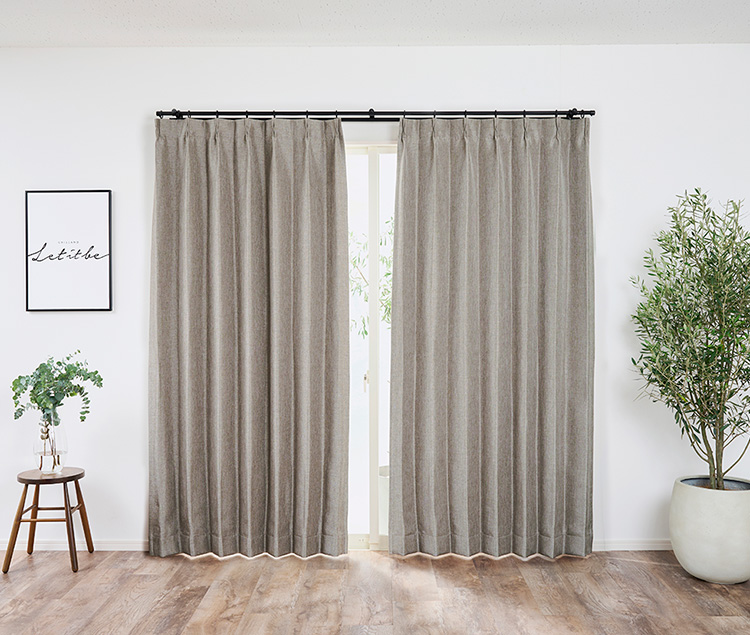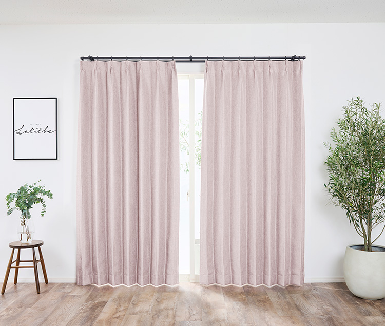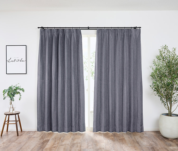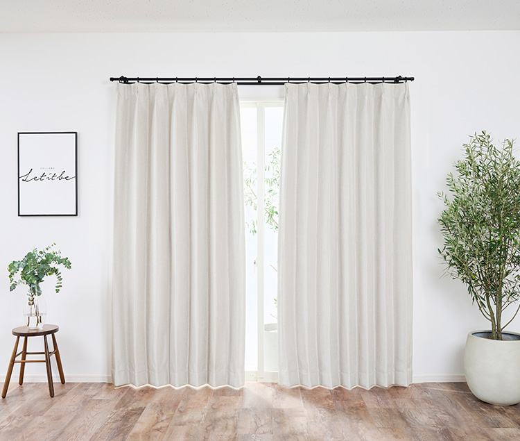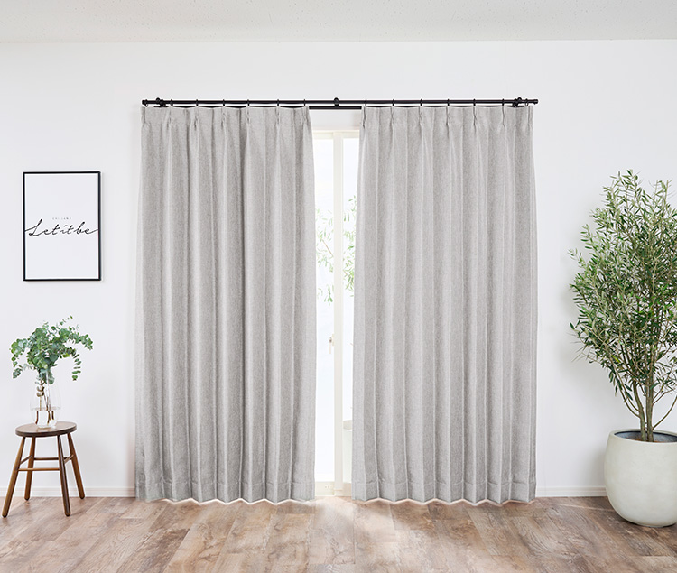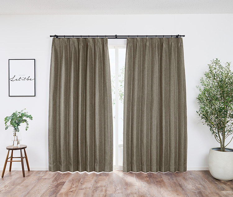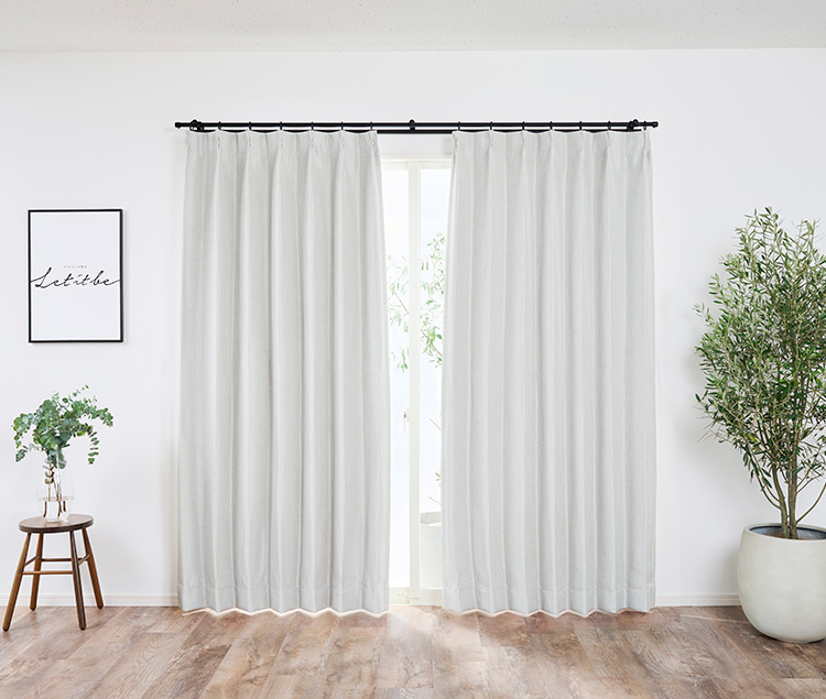 カーテンの仕上がりに対して約1.5倍の生地を使い、上部のヒダを2つ山で摘みます。ベーシックなスタイルでスッキリと仕上がります。