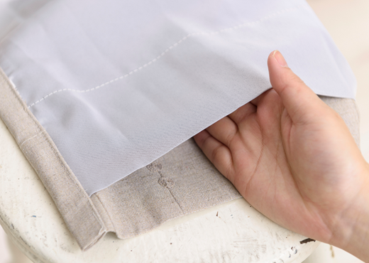カーテンの表生地の裏側にもう一枚、遮光用裏地を縫いつける縫製仕様となり、上の画像のように袋縫いのような形になっています。この袋の部分に空気層ができるため、外気を遮る遮熱効果が高まります。洋服で例えると、冬場に薄手のインナーを一枚プラスするだけで暖かく快適に過ごせるのと同じ理由です。
