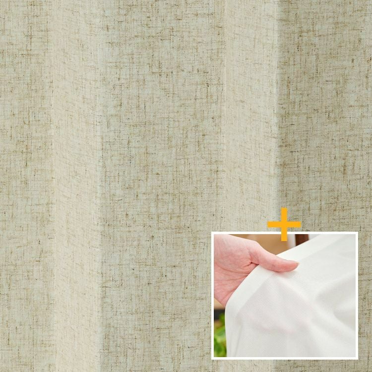 温かみを感じる杢調の生地の間にアクリル樹脂を挟み、遮光率100%、高い遮熱・断熱機能、防音効果、防炎機能を実現しました。必要な機能が全て揃った日本製のシームレス防炎完全遮光カーテンです。