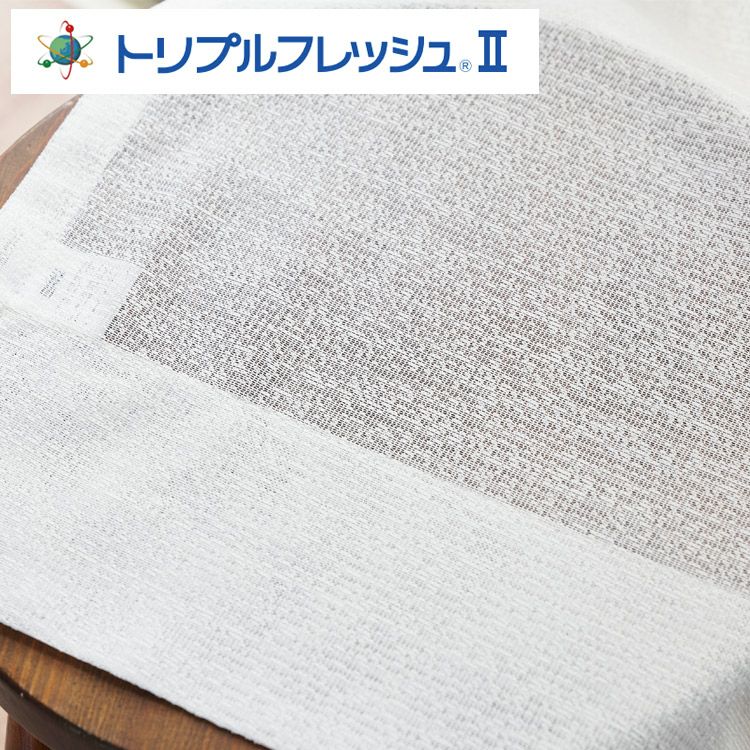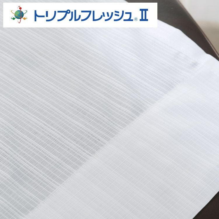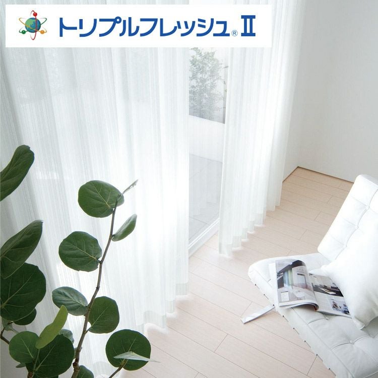消臭加工技術「トリプルフレッシュⅡ」を施した防炎レースカーテンです。無地調の為どんなカーテンにも合わせやすく、洗濯しても効果が持続します。