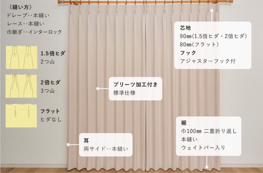 国内のオーダーカーテン専門の工場にて丁寧に縫製してお届けいたします。カーテンの裾が広がらず均等なウェーブを保つプリーツ加工も標準装。高級感のあるたおやかなドレープをお楽しみいただけます。