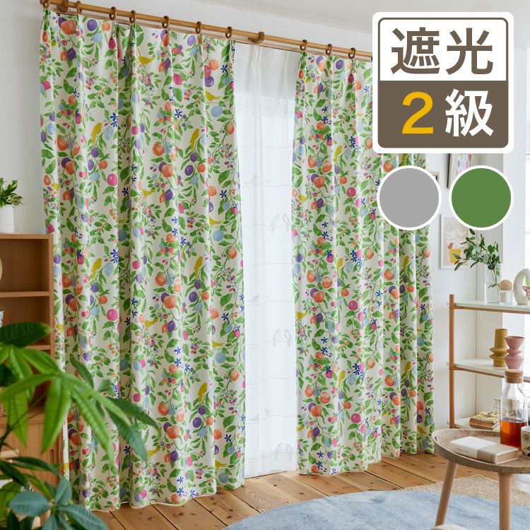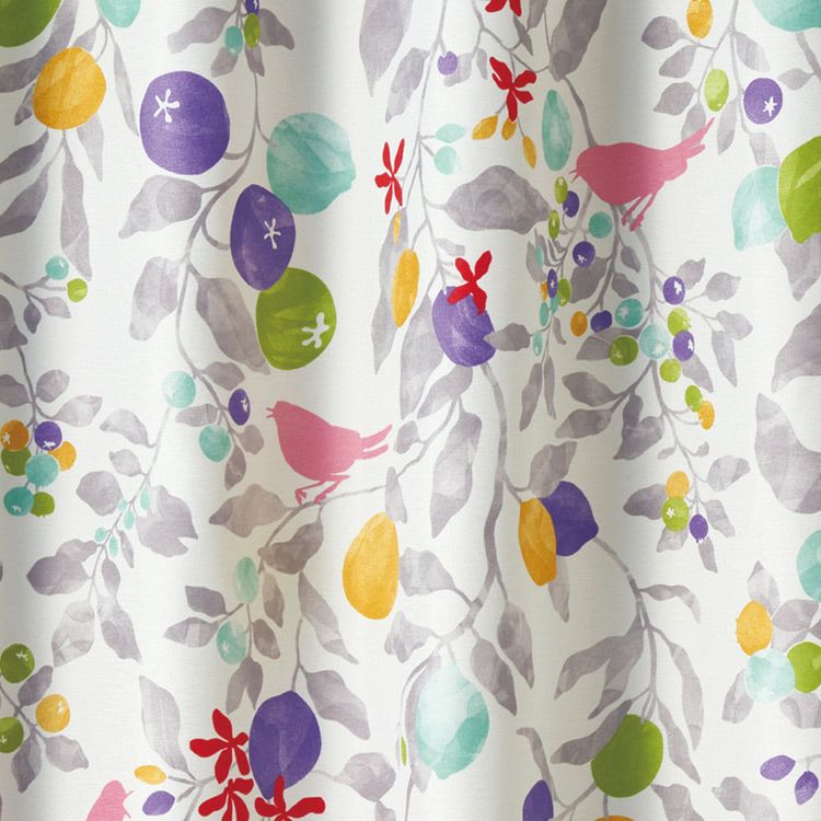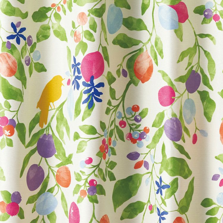 【生地サンプル】【2級遮光カーテン】小鳥や植物を鮮やかな水彩タッチで表現した フルーツトリ(D-1196)