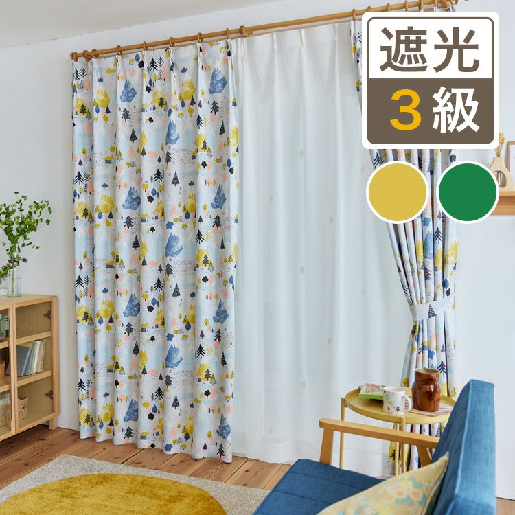 【生地サンプル】【3級遮光カーテン】雪山で暮らす人やイエティがかくれている楽しいデザイン ユキヤマ(D-1196)