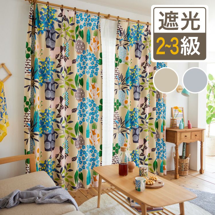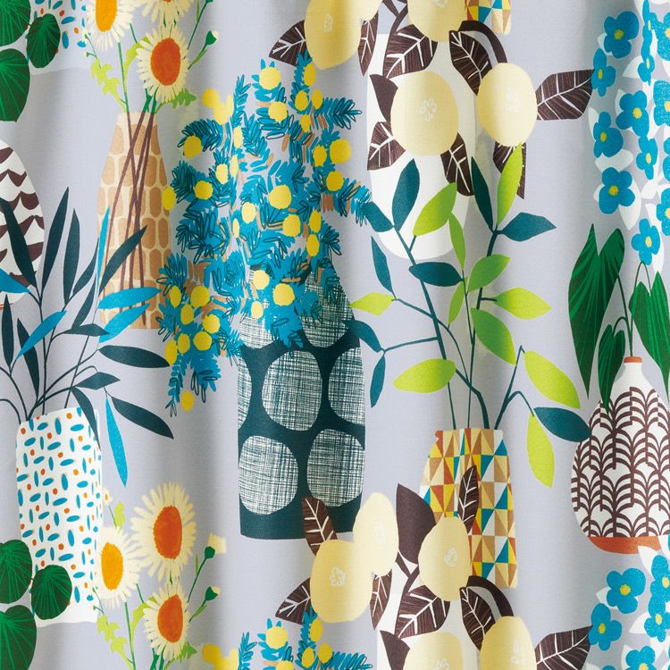 【生地サンプル】【2~3級遮光カーテン】可愛い花瓶と植物を大胆にデザインした フラワーポット(D-1196)
