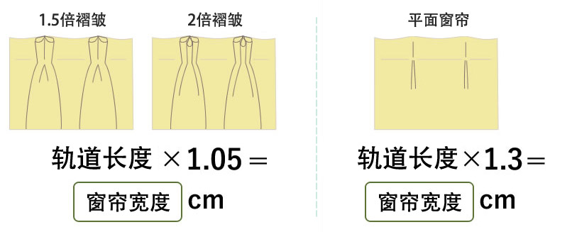※窗帘的宽度尺寸以轨道宽度×1.05为标准,但如果希望做出正好适合窗户尺寸的产品,推荐轨道宽度×1.03。做比轨道宽度稍宽裕一些的产品,是为了防止两侧开窗帘在拉上时有间隙和漏光,请根据您的用途和喜好指定窗帘的宽度尺寸。